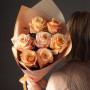 На фото букет из 7 персиковых роз. В составе: роза 7 шт, дизайнерская упаковка 1 шт, атласная лента 1 шт, . Все цветы свежие и ароматные, букет красиво оформлен и отлично подходит для подарка. Доступна доставка цветов или самовывоз.