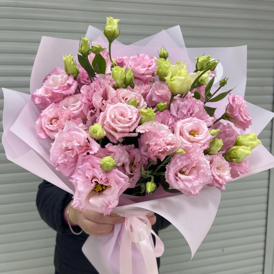 Упаковка дизайнерская - 3 шт. эустома розовая - 11 шт. бант атласный - 1 шт.