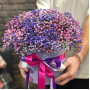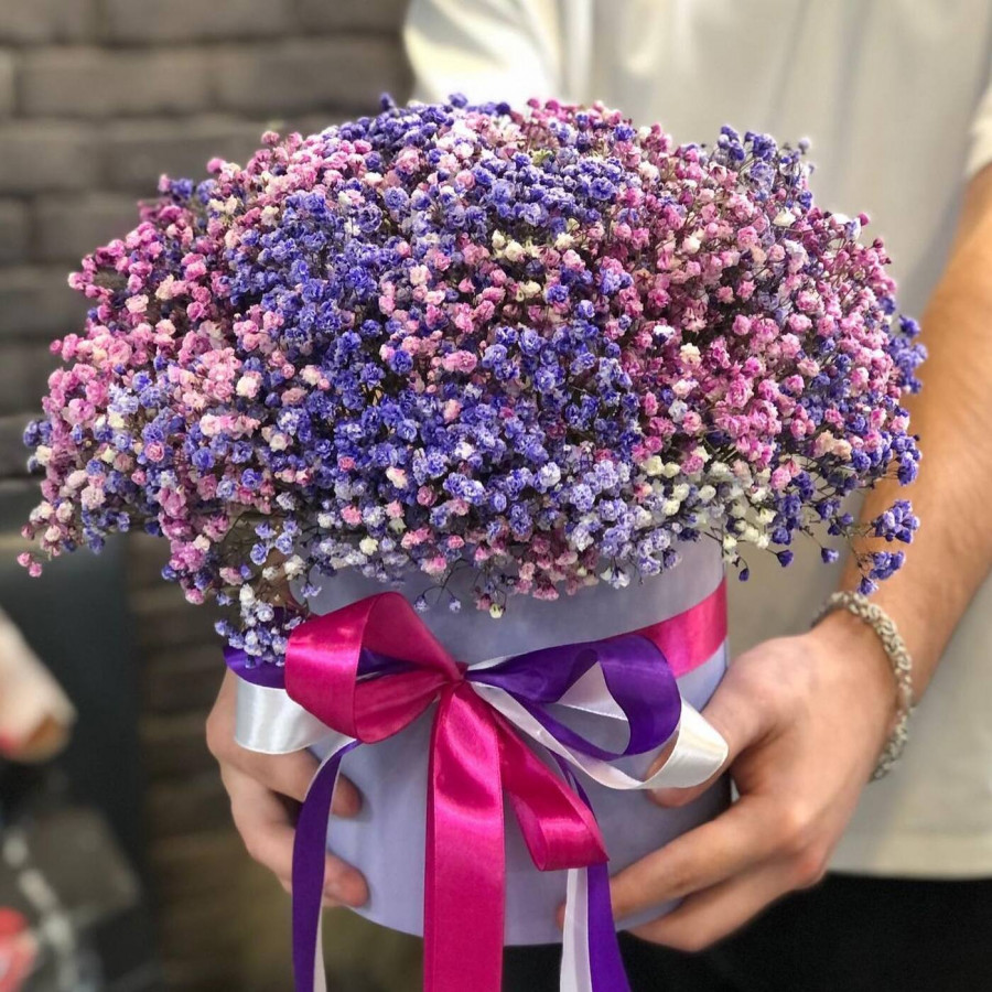 На фото гипсофила фиолетовая в коробке. В составе: гипсофила 7 шт, шляпная коробка (s) 1 шт, атласная лента 1 шт, . Все цветы свежие и ароматные, букет красиво оформлен и отлично подходит для подарка. Доступна доставка цветов или самовывоз.